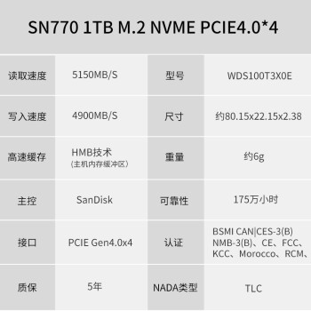 • 商品名称:西部数据 固态硬盘SN770 1T(WDS100T3X0E)